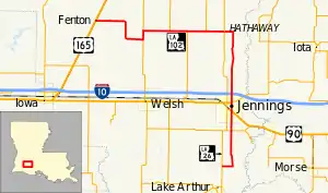 Louisiana Highway 102 (LA 102) is a state highway located in Jefferson Davis Parish. It runs 35.4 miles (57.0 km) in a northwest to southeast direction from U.S. Highway 165 (U.S. 165) in Fenton to LA 26 north of Lake Arthur.[1] The route is bannered west–east from Fenton to a point just east of the first junction with LA 26 at Hathaway. From this point to its terminus north of Lake Arthur, LA 102 travels in a north–south direction and is bannered accordingly. A largely rural route following section line roads, LA 102 passes through the city of Jennings in the southern portion of its route.
