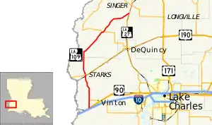 Louisiana Highway 109 (LA 109) is a state highway located in southwestern Louisiana that runs 40.0 miles (64.4 km) in a north–south direction from U.S. Highway 90 (US 90) and LA 3112 southwest of Vinton to LA 27 at Juanita, a point north of DeQuincy.[1] A largely rural route, LA 109 parallels the Texas–Louisiana border and passes through the community of Starks in Calcasieu Parish where it intersects LA 12. The southern terminus of LA 109 is located just north of I-10 (Exit 4) between Orange, Texas and Vinton, Louisiana.