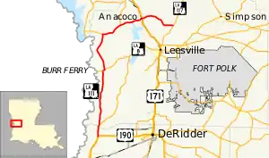 From the south, LA 111 begins at a junction with US 190 in Junction, a small community located in the northwest corner of Beauregard Parish. US 190 connects with Merryville to the south and DeRidder to the east. LA 111 heads north and crosses a bridge over Bayou Anacoco, simultaneously entering Vernon Parish.[2][3][4] Shortly afterward, LA 464 begins, splitting off to the northeast. Over the next 13 miles (21 km), LA 111 continues through a sparsely populated pine forest with small clusters of residences visible at points such as Almadane and Evans. It then reaches a T-intersection with LA 8 (Nolan Trace Parkway) at Burr Ferry, located less than two miles (3.2 km) from the Texas state line at the Sabine River.[2][5][6]