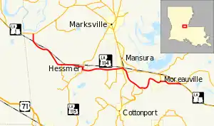 From the west, LA 114 begins at a T-intersection with LA 1 at the Red River in western Avoyelles Parish. This junction is located 1.6 miles (2.6 km) east of Echo, a small community in neighboring Rapides Parish and 2.9 miles (4.7 km) southwest of Fifth Ward. LA 114 crosses the Kansas City Southern Railway (KCS) at grade then follows the rail line southeast through a rural area known as Belle d'Eau. Here, the highway crosses Choctaw Bayou just outside the Grand Cote National Wildlife Refuge. After curving due east, LA 114 intersects LA 1188, which connects to LA 115 south of Hessmer. LA 114 continues into the village of Hessmer on West School Street and intersects LA 115 (Main Street), which connects to the nearby cities of Marksville and Bunkie. LA 114 turns south, running briefly concurrent with LA 115, before resuming an eastward course along East Main Street. Exiting Hessmer, LA 114 proceeds a short distance into the larger town of Mansura, where it becomes known as Baton Rouge Avenue.[2][3][4][5]