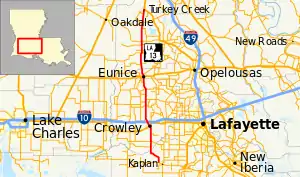 Louisiana Highway 13 (LA 13) is a state highway located in southern Louisiana. It runs 64.02 miles (103.03 km) in a north–south direction from LA 14 west of Kaplan to US 167 in Turkey Creek.