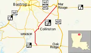 A largely rural route, LA 138 connects the small villages of Collinston and Mer Rouge, located northeast of Monroe. Its southern terminus (LA 134) leads to Monroe in neighboring Ouachita Parish, as well as the village of Oak Ridge in southern Morehouse Parish. The northern terminus is located at the east end of the concurrency of US 165 and US 425. The two highways split toward Monroe and the Arkansas state line, respectively, after heading west into Bastrop, the parish seat.
