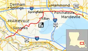 Class "B": La 22—From a junction with La-US 61 at or near Sorrento through or near Acy, Maurepas and Springfield to a junction with La-US 51 at or near Ponchatoula.— 1955 legislative route description[15]