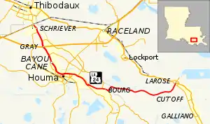 While traveling from Schriever through the neighboring areas of Magnolia, Gray, and Bayou Cane, LA 24 intersects several other routes that follow parallel bayous. These include LA 311 (Little Bayou Black), LA 316 (Bayou Blue), and LA 660 (Bayou Little Coteau). During this stretch, LA 24 also passes through a diamond interchange with US 90 at exit 202, which connects to Morgan City and New Orleans. In Bayou Cane, LA 24 intersects LA 3040 (Martin Luther King Boulevard), a parallel four-lane highway and commercial corridor through the city of Houma.[2][3][4]
