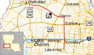 In the original Louisiana Highway system in use prior to 1955, LA 26 was part of two different routes. The east–west section from DeRidder to Oberlin made up the entirety of State Route 52.[10][11] The north–south section from Oberlin to Lake Arthur was part of State Route 25,[11][12] a long U-shaped route that continued east along the present LA 14 to New Iberia then north along LA 31 to Opelousas.[13] Both Routes 25 and 52 were included in the first 98 state highway routes designated by the Louisiana Legislature in 1921 as part of an act which also created the Louisiana Highway Commission, an early forerunner of the Louisiana Department of Transportation and Development (La DOTD).[14] Additionally, the stretch between DeRidder and Elton served briefly as part of US 190 when that highway was extended westward from Baton Rouge in 1935.[15][16] However, the roadway was still gravel west of Oberlin and dirt from Oberlin to Elton. In the late 1930s, US 190 was shifted twice to take advantage of paved roadways in the area. It was ultimately routed via US 171 from DeRidder south to Ragley and what was then State Route 7 through Kinder, eliminating the longest stretch of the unpaved roadway on US 190 within the state.[17][18]