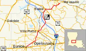 | Bunkie | 39.281 | 63.217 | South end of US 71 concurrency | ||