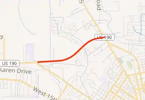 A decade later, in October 1967, construction began on the segment extending west from LA 25.[1] This segment was designated as LA 3114 and was opened to traffic in January 1969.[1] Two years later, it became the new routing of U.S. 190, and the old alignment through town became U.S. 190 Business. With this change, the LA 3114 designation was dropped, and LA 25 was truncated to its current terminus at U.S. 190 on the north side of Covington.