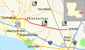 From the west, LA 36 begins at an intersection with LA 21 in Covington and heads east. It enters a brief overlap with LA 59 in Abita Springs for approximately a quarter of a mile. It absorbs LA 435 and then heads east, terminating at LA 41 in Hickory.