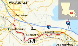 Louisiana Highway 44 (LA 44) is a state highway in Louisiana that serves Ascension, St. James, and St. John the Baptist Parishes. It runs from west to east, parallel to the east bank of the Mississippi River, from Prairieville to LaPlace. It spans a total of 50.1 miles (80.6 km). Throughout its run, LA 44 is known as North/South Burnside Avenue, River Road, West/East Jefferson Highway, West 5th Street, and Main Street.