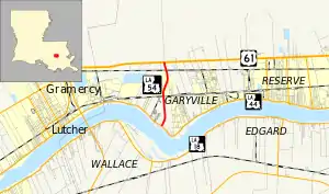 Route 1121 was created in 1930 by an act of the state legislature.[6] It originally existed as a spur off of Route 1 serving Garyville, which was situated around a lumber mill. At the time, the main route between New Orleans and Baton Rouge was the Jefferson Highway, an auto trail which followed the modern River Road past Garyville. This had become part of Route 1 in 1921[6] and the original route of US 61 in 1926.[7][8] Route 1121 followed a parallel alignment to the modern LA 54, running through the center of Garyville to the north side of the Yazoo & Mississippi Valley (now the Canadian National) railroad tracks. It then made a loop back across the tracks to an intersection with itself.[6]