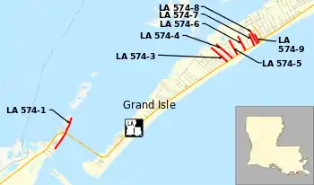Louisiana Highway 574 (LA 574) is a collection of eight current and four former state-maintained streets in Grand Isle, located in lower Jefferson Parish. All twelve routes were established with the 1955 Louisiana Highway renumbering.