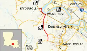Louisiana Highway 69 (LA 69) is a state highway located in southeastern Louisiana. It runs 15.36 miles (24.72 km) in a general north–south direction from LA 70 in Grand Bayou to LA 1 northwest of White Castle.