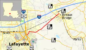The highway connects Lafayette, the parish seat and the largest city in Lafayette Parish, with the small city of Breaux Bridge in neighboring St. Martin Parish. The entire route parallels Interstate 10 (I-10), which is located an average of about 1.5 miles (2.4 km) to the north and continues eastward toward Baton Rouge, the state capital. LA 94 is also signed as an alternate route to I-10 when the interstate is closed due to traffic accidents or construction work. Though it is a distinct east-west route, the signage for LA 94 carries no directional banners.