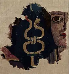 Male face with a caduceus 200–400 AD. The staff suggests the Greek deity Hermes.[42]