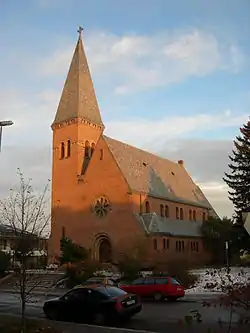 Lovisenberg Church (Norwegian: Lovisenberg kirke) is a church in the neighborhood of Lovisenberg in the district of St. Hanshaugen in Oslo, Norway. The church is a basilica in Romanesque Revival style. The building is made of red brick and has a gable roof covered with slate. The bell tower is located to the side of the ridge and baptismal sacristy is to the right of the main entrance.[2]