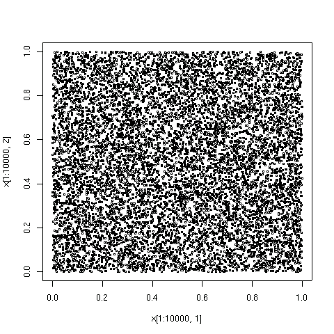 For comparison, here are the first 10000 points in a sequence of uniformly distributed pseudorandom numbers. Regions of higher and lower density are evident.