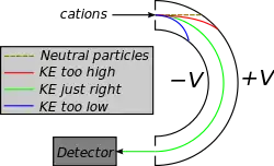 Diagram of an electrostatic analyzer in the hemispherical geometry. Only ions of a selected energy pass through to the detector. - Vacuum pumps; Studies are performed in ultra-high vacuum (UHV) conditions (< 10−10 torr) in order to prevent unwanted interference with the ion beam and/or sample. Common UHV pumps include turbomolecular and ion pumps, with roughing pumping typically performed using a rotary vane pump. Due to the extreme surface (i.e. first-layer) sensitivity of LEIS, samples also need to be rigorously cleaned prior to analysis. Some common processes used to clean samples include sputtering and annealing. Appropriate equipment for cleaning must be contained within the vacuum chamber.
