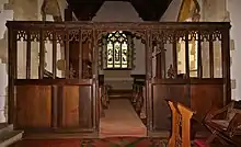 Wufwig, Bishop of Dorchester consecrated a parish church at Lower Heyford in the 11th century.[2] The current Church of England parish church of Saint Mary was built in the 13th century. It was largely rebuilt in a Decorated Gothic style in the first half of the 14th century, with north and south aisles joined to the nave by two-bay arcades. The east end of the south aisle is a chapel with niches for statues or figurative reliefs. In the 15th century the Perpendicular Gothic clerestory and south porch were added,[5] and a rood screen with a rood loft for which a stair turret was inserted in the south aisle.[6] An opening high in the wall west of the south arcade suggests that the nave once had a west gallery. This has been removed, as has the rood and rood loft, but the 15th-century wooden screen to the chancel survives.