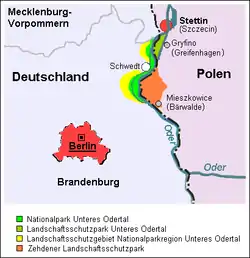 ![]() Lower Oder Valley International Park Germany (pale blue) & Poland (pale mauve) · Bright green: Lower Oder Valley National Park – German core area · Olive green: Lower Oder Valley Landscape Park – Polish core area · Yellow: Landscape Conservation Area Lower Oder Valley National Park Region – German non-core area · Orange: Cedynia Landscape Park – Polish non-core area | |