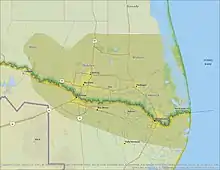 The Lower Rio Grande Valley (Spanish: Valle del Río Grande), commonly known as the Rio Grande Valley or locally as the Valley, is a socio-cultural region spanning the border of Texas and Mexico located in a floodplain of the Rio Grande near its mouth.[1] The region includes the southernmost tip of South Texas and a portion of northern Tamaulipas, Mexico. It consists of the Brownsville, Harlingen, Weslaco, Pharr, McAllen, Edinburg, Mission, San Juan, and Rio Grande City metropolitan areas in the United States and the Matamoros, Río Bravo, and Reynosa metropolitan areas in Mexico.[2][3] These cities are surrounded by many small neighborhoods or colonias.[4] The area is generally bilingual in English and Spanish, with a fair amount of Spanglish[5] due to the diverse history of the region.[6] A large seasonal influx occurs of "winter Texans" — Texans who come down from the north for the winter and then go back up north before summer arrives.[7]