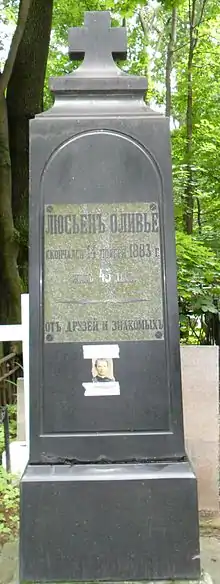 Lucien Olivier (Russian: Люсьен Оливье) (1838–14 November 1883) was a Russian chef of Belgian and French descent,[1] and owner of Hermitage restaurant in the center of Moscow, Russian Empire, in the early 1860s. He was born in Moscow. Olivier is known for the creation of Olivier salad, also known as "Russian salad". The secret of the recipe was not disclosed until his death. Lucien Olivier died in Yalta from heart disease at age 45 in 1883 and was buried at Vvedenskoye Cemetery. His tomb was lost until 2008.[2] The current salad has numerous variations which are a mixture of every component Olivier used to add to his famous dish as well as ingredients that he did not use himself, with a mayonnaise dressing.