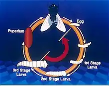 The life cycle begins with the mating of the male and female species of the fly and upon completion, the female begins oviposition and will lay the eggs on a place of interest such as an open wound, an orifice, or a pile of faeces. Once the eggs have been laid they will take approximately one full day to hatch, which is a short time period among flies.[1] Upon hatching, the larvae will begin the three stages of larvae development consistent with this family. The first stage occurs approximately after 2 days, while the second stage occurs after 2 and a half days, and finally the third stage occurs at approximately 4 to 5 days.[1]