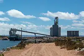 The new process is expected to be capable of loading a Panamax vessel in 3 days.[20] The purpose-built MV Lucky Eyre arrived in March 2020 to serve as the transshipment vessel. Its owners consider it a "world first" vessel as it provides a self-propelled, self-discharging transhipment solution.[31] The larger ships will be anchored 5 nautical miles (9.3 km; 5.8 mi) offshore. The transfer ship is 87 metres (285 ft) long and can transfer up to 13,800 tonnes per day. It will undergo a three-stage commissioning process before entering service.[32]