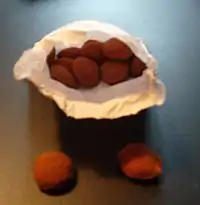 The Lucky Tattie is a type of traditional sweet made in Scotland. The lucky tattie is made of a white fondant solid core flavoured with cassia, and steamed and covered with cinnamon powder. The tattie used to contain a small plastic lucky charm in the centre (like a tiny animal or toy), hence the lucky. Due to health and safety they were removed.[1]