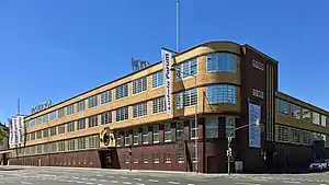 The umbrella factory Brauer, Jülicher Straße 97-109, is a two- and three-storey building by the architects Josef Bachmann and Alexander Lürken from 1928, which was listed in 1977 as 3-storey skeleton building with rounded corners and flat roof; the facades are yellow bricked, the base with red clinker facing. The building, which was rather atypical for Aachen in its time, was borrowed from the Bauhaus style with its very striking designs. Typical features include the play with basic geometric shapes, such as the round window above the former main entrance.