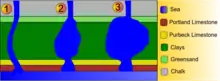 Forming the back of the cove is a 250-metre-wide (820 ft) band of chalk, which is considerably more resistant than the clays and sands, but less resistant than the limestones. The entrance to the cove is a narrow gap in the limestone bands, formed by wave action and weathering. The wide part of the cove is where the weak clays and greensands have been eroded.