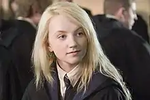 The character is portrayed by Irish actress Evanna Lynch in the film adaptations of Harry Potter and the Order of the Phoenix, Harry Potter and the Half-Blood Prince, and both Harry Potter and the Deathly Hallows – Part 1 and Part 2.[3] On her website, Rowling described the actress as "perfect" for the role.[4] Lynch had to bleach her hair a light blonde colour in order to play the role,[5] and has received critical acclaim.[6][7]