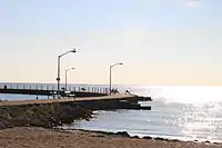 Its most prominent feature is a large crescent-shaped pier made of concrete, approximately 800 ft (240 m) long and reaching around 200 feet (61 m) out into Lake Erie. The pier is flanked by sandy beaches and man-made rock and concrete embankments. On most days, the Davis–Besse Nuclear Power Station in Port Clinton and Toledo Harbor Light can be seen from the pier. The city is served by Mason Consolidated Schools.