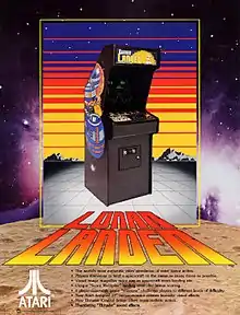 Lunar Lander proved moderately commercially successful, selling 4,830 cabinets.[5] Cash Box noted in September 1979 that the machines were very popular with customers.[11] It was Atari's first vector graphics game and the first multiple-perspective video game with the inclusion of the up-close view of the lander.[1][3] Atari developed a two-player version of the game, but only two prototypes were ever made as it did not enter production.[10] The two-player version was cancelled as Lunar Lander's popularity was soon overtaken by Atari's Asteroids (November 1979), which used the same vector graphics engine and which had initially been based on Lunar Lander's code.[10] Atari ceased production early on Lunar Lander in favor of shipping Asteroids games in Lunar Lander cabinets; the first 300 Asteroids games were released with Lunar Lander artwork on the side.[1][4][10] The Atari Lunar Lander was the most popular version to date of the "Lunar Lander" concept, surpassing the prior Moonlander and text-based games, and most later versions of the concept are implicitly or explicitly based on the Atari version.[4]