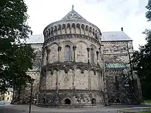 Seen from outside, the different elements of the building are clearly discernible as independent volumes, "as if they could be taken apart and put together again".[74] The apse of the cathedral is a "forcefully articulated" semi-circle.[31] Compared to its predecessors in Mainz, its composition is somewhat more elaborate with three distinct storeys each divided into fields, the lower by lesenes and the middle by columns with decorated capitals. The uppermost part is a gallery of shallow barrel vaults carried by 21 smaller columns, which open towards the exterior.[77] The apse is the most well-preserved part of the Romanesque building and has been described as "the artistic high point of the exterior".[78] The southern portal of the nave is perhaps the oldest of the cathedral. Five decorated archivolts supported by small columns with variously decorated capitals, frame a tympanon depicting the Lamb of God.[79] The northern portal is slightly later and more richly decorated. Its tympanon depicts Samson wrestling with the lion.[80] Two bronze doors built by Carl Johan Dyfverman serve as the main entrance in the centre of the west facade. They have 24 reliefs with subjects from the Bible, particularly the Old Testament. Above the doorway, the tympanon depicts Christ, Canute IV of Denmark and Saint Lawrence.[71] The cathedral has two sacristies.[4] The building material of the cathedral is mostly sandstone quarried in the area around Höör. The main walls are constructed as shells of sandstone filled with fieldstone mixed with lime mortar. The thickness of the walls is around 2 to 3 metres (6.6 to 9.8 ft).[4][81]