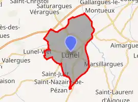 Lunel is located 21 km (13 mi) east of Montpellier and 28 km (17 mi) southwest of Nîmes (Gard).