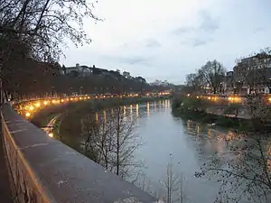 Lungotevere (Italian for Tiber Waterfront) is an alley or boulevard running along the river Tiber within the city of Rome. The building of the Lungoteveres required the demolition of the former edifices along the river banks and the construction of retaining walls called muraglioni (massive walls).[1]