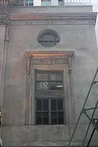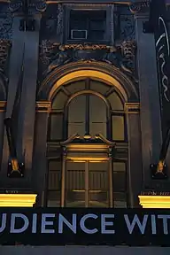 The Globe Theatre was built with an entrance on 1555 Broadway,[lower-alpha 2] between 46th and 47th Streets.[23][24] The Broadway elevation was described in the New York Dramatic Mirror as the main entrance,[15][25] though other sources stated that the Broadway entrance was secondary to that on 46th Street.[14][16] The Broadway elevation was four stories high[26] and measured 24 feet (7.3 m) wide.[27] It had been adapted from a brownstone residence and contained signs in front of it.[24] The facade was flanked by Ionic pilasters and contained interspersed stone panels.[15][16][28] The second floor was decorated with "elaborately ornamented" arched casement windows.[29] There were also masks, garlands, cherubs, pediments, and a cornice on the facade.[26] The entrance led to the box-office vestibule and a corridor to the auditorium.[7]