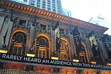 The first story contains a granite water table, blocks of rusticated stone, and doorways in each bay. The recessed doorways are originally designed as archways, which are partially concealed by the marquee.[7][13] The westernmost door is the stage door.[13][12] The easternmost two sets of doors lead into the ticket lobby, and the other doors contain auxiliary exits from the auditorium. Each of the lobby and auditorium doors contain paneled-wood doors with bronze handles, and the openings are also flanked by display boxes. The marquee above the doorways was added after the theater opened; it contains a band with foliate decorations, above which acanthus leaves rise vertically. The first story is topped by a frieze containing foliate decorations and flowers. Above the five central doorways are archivolts with sculpted heads, as well as modillion blocks with alternating somber and snarling faces.[13] The arches and faces served to identify the building's theatrical use.[17]