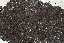 Luprops tristis, the Mupli beetle, is a plant detritus eating darkling beetle found in parts of India. The adult beetle is black and around 8 millimetres (0.31 in) long. While they are usually harmless to humans, when squeezed or picked up, they produce a defensive phenolic secretion that causes skin burns. Luprops beetles have a notorious reputation since they can make life difficult when large populations invade farm houses, as reported in some parts of southern India, especially the state of Kerala. In Kerala they are variously called Muplivandu ("മുപ്ലി വണ്ട്") or Kotteruma ("കോട്ടെരുമ") or Karivandu ("കരിവണ്ട്") in Malayalam.[1] The name "Mupli beetle" comes from the region where the first major infestations of this beetle in Kerala were noted. It causes irritation to eyes and suffocation if slept near its dead colony. Mostly found in area where there is rubber tree plantation . It flies towards the houses which is painted with light colors, muplivandu is attracted to the lights and light colours (white paint).