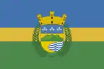 It consists of three horizontal stripes, the blue top and green bottom are double of width of the yellow central stripe. Blue makes reference to the sky and the sea; yellow represents the sand of its beaches and green represents the vegetation of the mountains. In the center stripe resides the coat of arms of the municipality superimposed and surrounded by two palm tree leaves crossed at the bottom.[31]