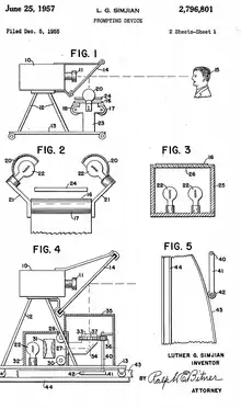 Simjian held a patent on the teleprompter.[3][7] However, he is not its sole inventor.[2] The invention of the teleprompter is usually credited to Hubert Schlafly, an engineer working with CBS and Fred Barton, an actor, who developed a mechanical cueing device in the 1950s. Simjian and Jess Oppenheimer, the creator and producer of the classic sitcom I Love Lucy, improved it and replaced it with an optical teleprompter. Hayward wrote that the advantage of the optical teleprompter proposed by Simjian and Oppenheimer was "its ability to break down the division between the viewer and person on camera by allowing for direct eye contact on the part of the presenter with the camera aperture."[23] The prompting device was applied for patent in 1955 and it was granted in 1957.[22] Hayward argues that:[24]
