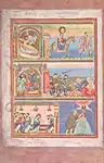 The Codex Aureus of Echternach is an early 11th-century illuminated Gospel Book containing the Vulgate versions of the four gospels. One of the most lavishly illustrated Ottonian manuscripts, it was produced at the Abbey of Echternach under the direction of Abbot Humbert. The refined Echternach style of painting is characterized by rich colouring, clear shapes and careful accentuation of the figures, interpreting the art of the Master of Trier with considerable originality. The Echternach illuminators drew on the style and iconography of much older works found in the libraries of Trier and Reichenau. The Codex Aureus is one of just two manuscripts which was kept at Echternach over the centuries, most of the others being produced for the Holy Roman Emperor Henry III. It is now in the German National Museum in Nuremberg.[2][3]
