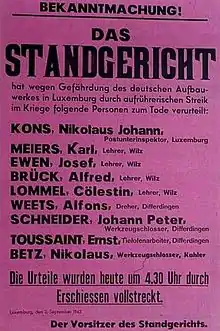 Conscription was particularly unpopular. On 31 August 1942, shortly after the announcement that conscription would be extended to all men born between 1920 and 1927, a strike began in the northern town of Wiltz.[15] The strike spread rapidly, paralysing the factories and industries of Luxembourg.[21] The strike was quickly repressed and its leaders arrested. 20 were summarily tried before a special tribunal (in German, a "Standgericht") and executed by firing squad at nearby Hinzert concentration camp.[15] Nevertheless, protests against conscription continued and 3,500 Luxembourgers would desert the German army after being conscripted.[22]