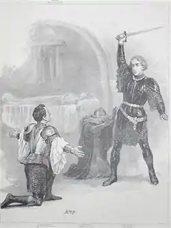 Irving and Terry began with Hamlet in 1878. Their 1879 production of The Merchant of Venice ran for an unusual 250 nights, and success followed success in the Shakespeare canon as well as in other major plays.[18] Other celebrated productions included Much Ado About Nothing,[19] The Lady of Lyons by Edward Bulwer-Lytton (1878), Romeo and Juliet, King Lear, The Lyons Mail by Charles Reade (1883), the immensely popular Faust by William Gorman Wills (1885, which even drew applications for reserved seats from foreigners), Macbeth (1888, with incidental music by Sir Arthur Sullivan[20]), Henry VIII (1892),[21] Becket by Alfred Tennyson (1893), King Arthur by J. Comyns Carr, with incidental music by Sir Arthur Sullivan (1895),[22] Cymbeline (1896) and Victorien Sardou and Émile Moreau's play Madame Sans-Gêne (1897).