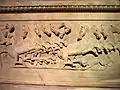 The sarcophagus is decorated with reliefs, the side reliefs illustrating a lion-hunt and a boar-hunt, while the reliefs at the end show fighting centaurs and sphinxes.[5]