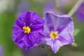 Lycianthes rantonnetii, the blue potato bush or Paraguay nightshade,[1] is a species of flowering plant in the nightshade family Solanaceae, native to South America.[2] Growing to about 6 ft (1.8 m) tall and broad,[1] it is a rounded evergreen shrub with a somewhat lax habit. A profusion of trumpet-shaped, bright blue-purple flowers with a prominent yellow eye appear in summer, followed by red berries. It is widely cultivated and may be hardy in mild or coastal areas. Alternatively it can be grown in a container and brought under cover in winter. It requires a sheltered location in full sun.[3] Though related to food plants like the potato and tomato, all parts of the plant are considered toxic to humans.
