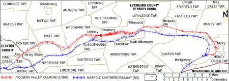 The line runs generally west between Muncy (in Lycoming County) and Avis (in Clinton County). Other communities served include Montoursville, Williamsport (and its western neighborhood of Newberry), the unincorporated village of Linden (in Woodward Township) and Jersey Shore (all in Lycoming County). 37 miles (60 km) of track are in Lycoming County and 1-mile (1.6 km) is in Clinton County.