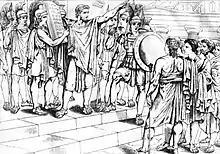 According to Plutarch's Lives and other sources, when Lycurgus became confident in his reforms, he announced that he would go to the oracle at Delphi to sacrifice to Apollo. However, before leaving for Delphi he called an assembly of the people of Sparta and made everyone, including the kings and Gerousia, take an oath binding them to observe his laws until he returned. He made the journey to Delphi and consulted the oracle, which told him that his laws were excellent and would make his people famous. He then disappeared from history. One explanation was that being satisfied by this he starved himself to death instead of returning home, forcing the citizens of Sparta by oath to keep his laws indefinitely.[17] He later enjoyed a hero cult in Sparta and Spartans retained much respect towards him.[18][19]