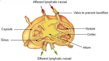 Lymph enters the convex side of a lymph node through multiple afferent lymphatic vessels, which form a network of lymphatic vessels (Latin: plexus) and from here flows into a space (Latin: sinus) underneath the capsule called the subcapsular sinus.[2][3] From here, lymph flows into sinuses within the cortex.[3] After passing through the cortex, lymph then collects in medullary sinuses.[3] All of these sinuses drain into the efferent lymphatic vessels to exit the node at the hilum on the concave side.[3]