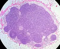The lymph nodes, the spleen and Peyer's patches, are known as secondary lymphoid organs. Lymph nodes are found between lymphatic ducts and blood vessels. Afferent lymphatic vessels bring lymph fluid from the peripheral tissues to the lymph nodes.[4] The lymph tissue in the lymph nodes consists of immune cells (95%), for example lymphocytes, and stromal cells (1% to 5%)[5] The genesis of lymph nodes begins within the blood and the lymphatic system.[4] Interactions between stromal and hematopoietic cells are important for the development of lymph nodes. Crosstalk LEC, lymphoid tissue inducer cells and mesenchymal stromal organizer cells initiate the formation of lymph nodes.[1]